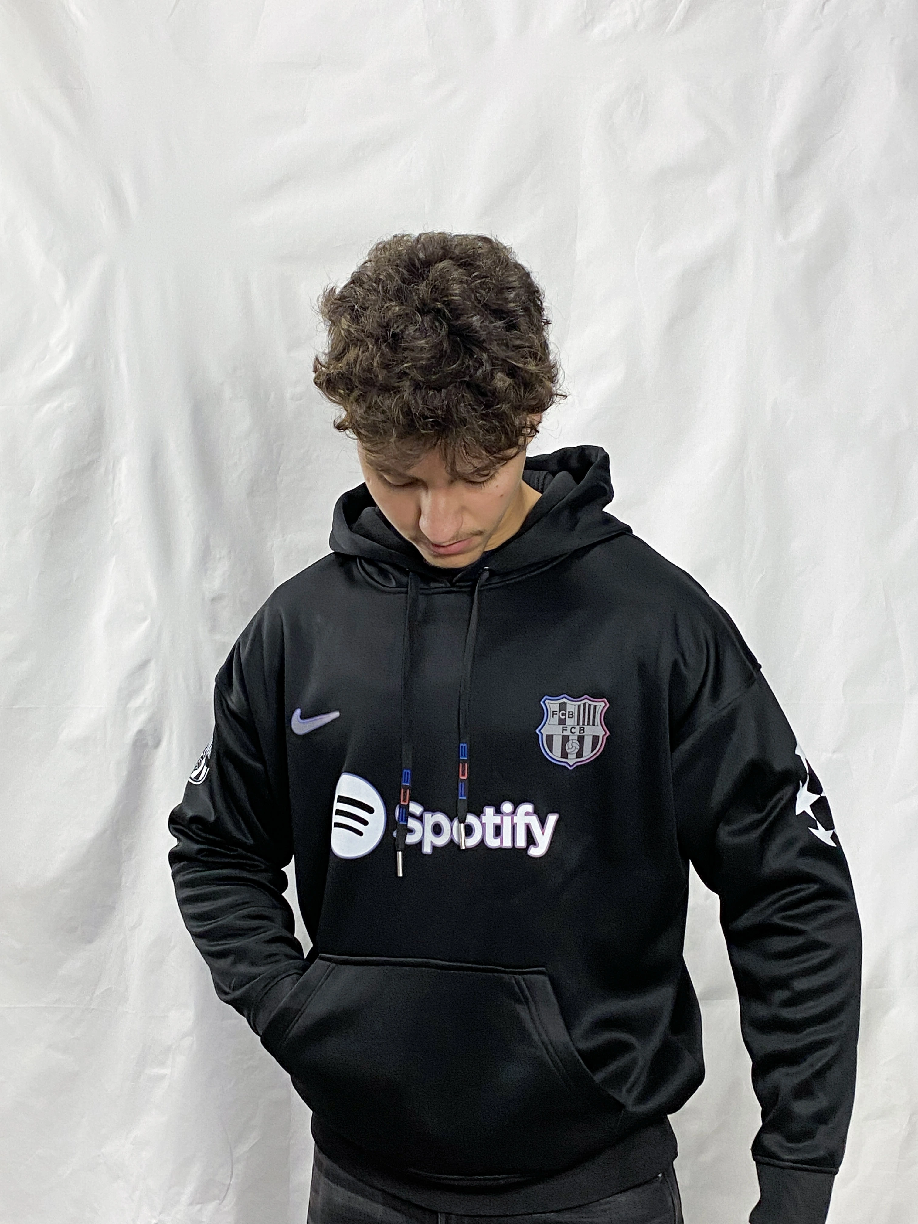 Design exclusif FC Barcelone avec logo Spotify, écusson Barça et bandes blaugrana sur la capuche et le dos ! 🇪🇸💙❤️